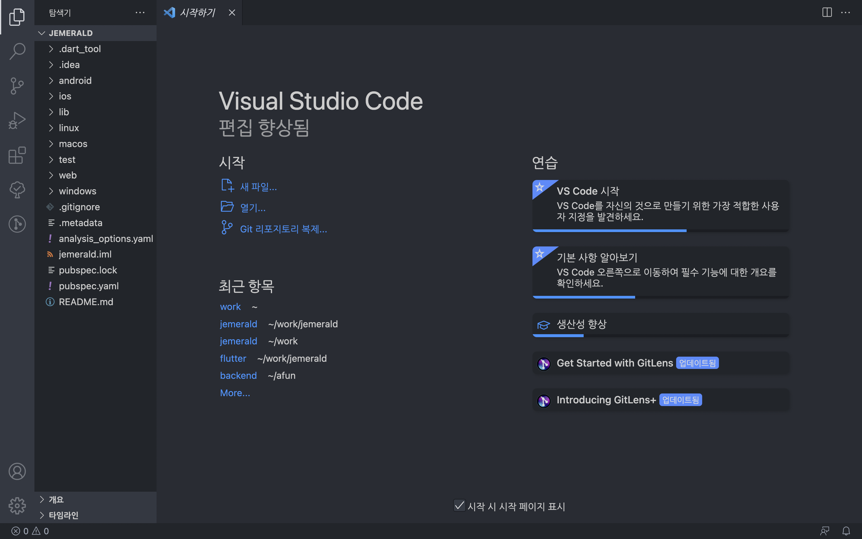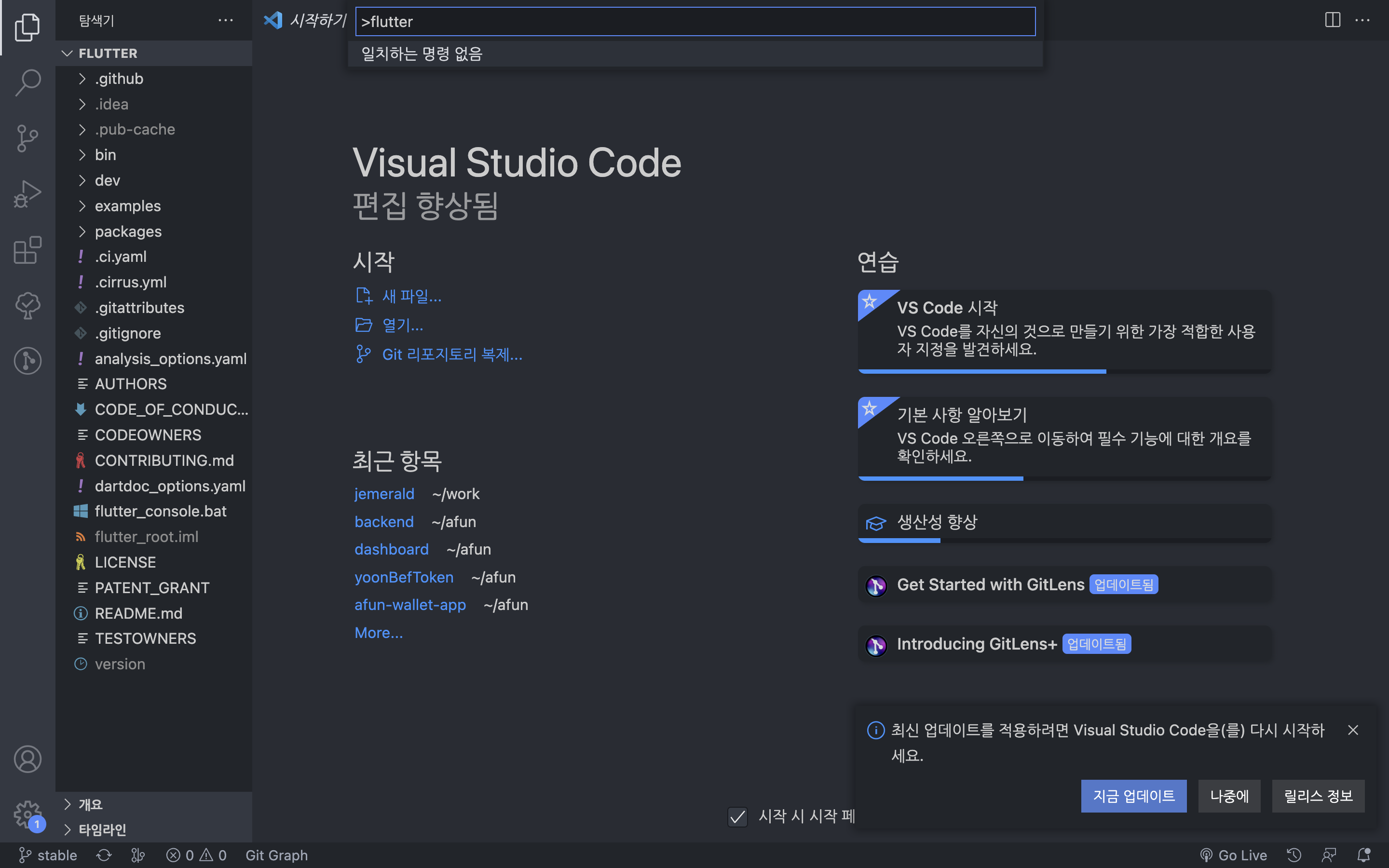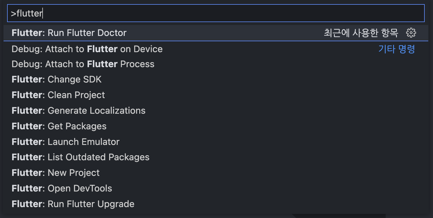 근데 VScode command + shift + P 에서 flutter 검색은 여전히 안돼서..