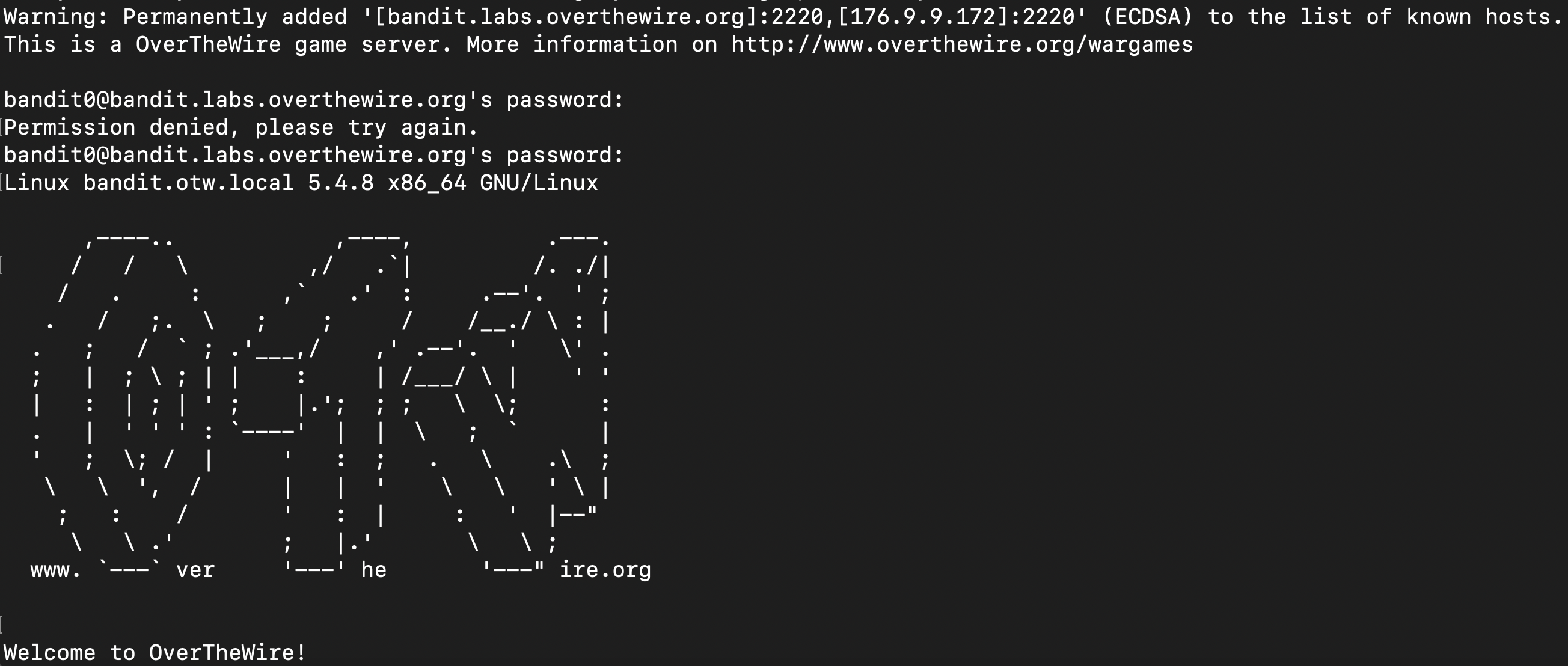 터미널에 ssh 명령어를 통해 다음과 같이 입력 (포트번호 2220, 로그인할 유저네임 bandit0)