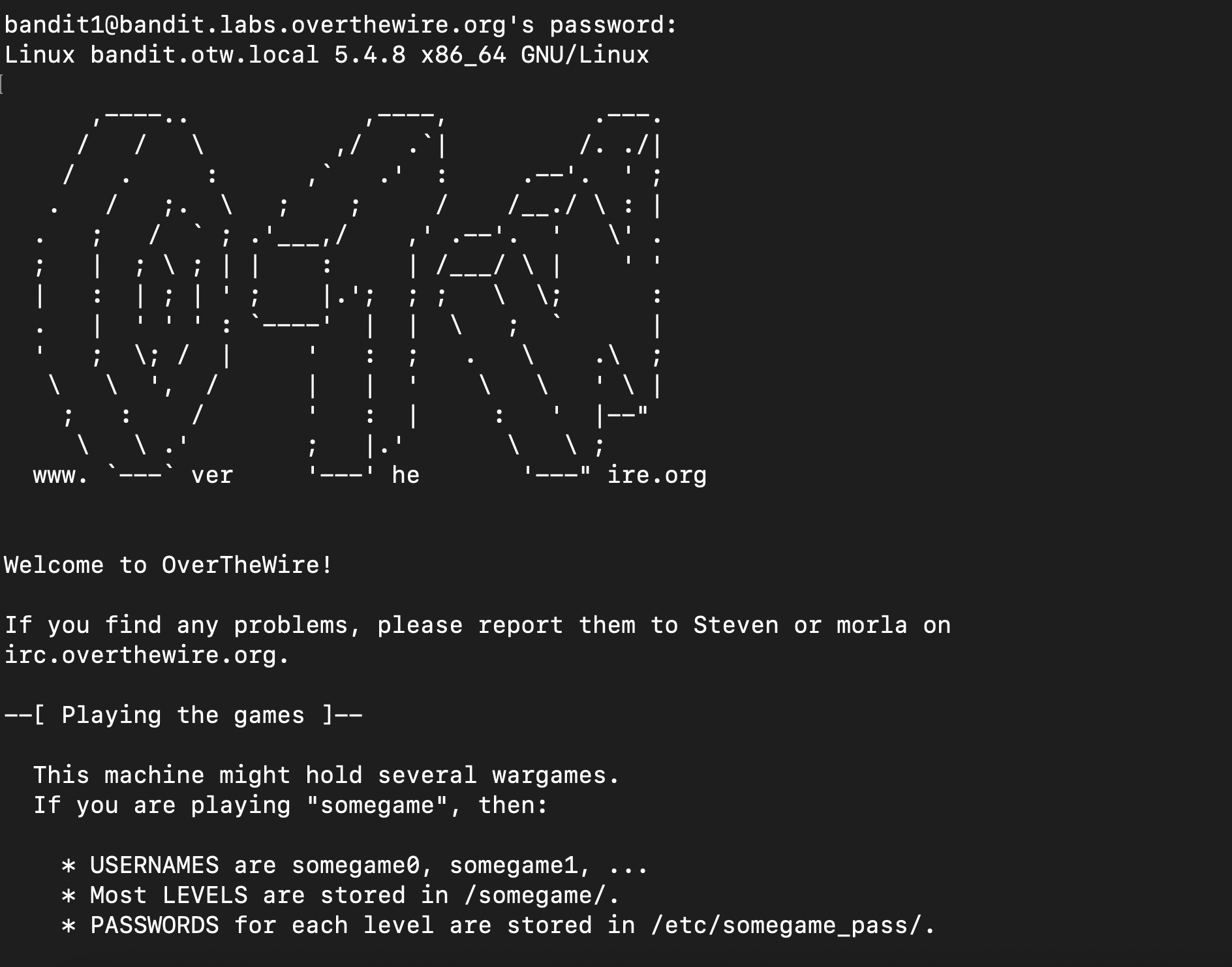 새 터미널을 열어서 위 ssh 명령어를 입력하고 bandit0에서 얻은 키를 비번으로 입력하면 된다!