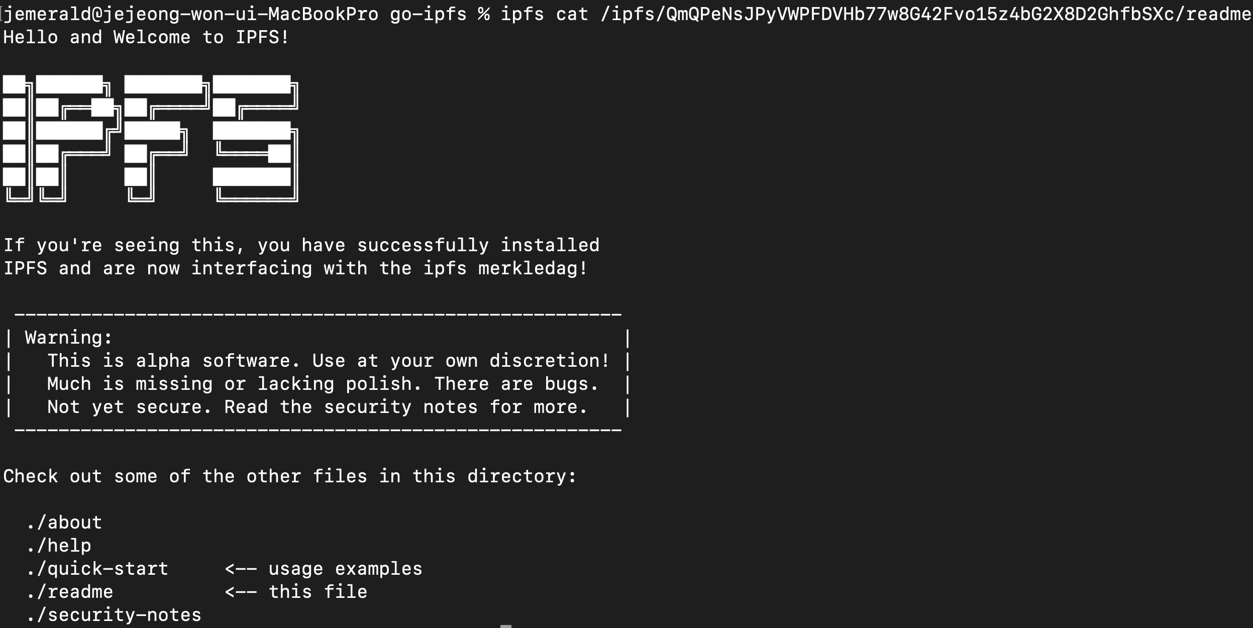 ipfs cat /ipfs/<발급 받은 자신의 ipfs hash>/readme