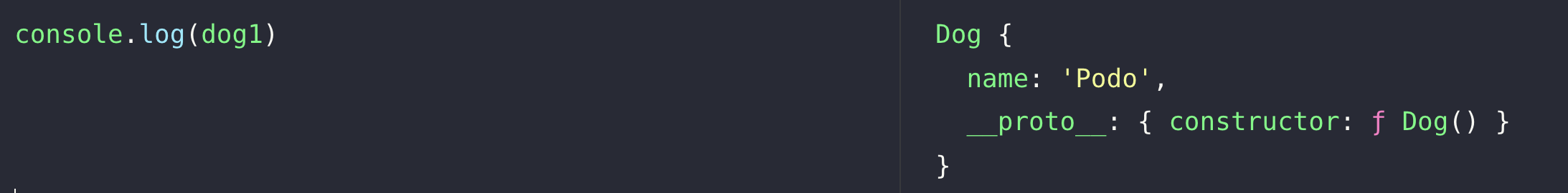 생성자 함수는 다음과 같고 dog1 이라는 객체를 생성했다고 하자.