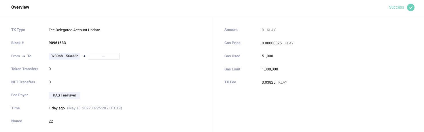 TX Type 이 Fee Delegated Account Update (정상 트랜잭션은 Smart Contract Execution)