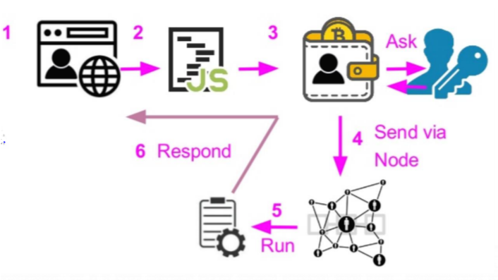 4. 웹 서버는 블록체인 네트워크의 스마트 컨트랙트를 실행하여 사용자에게 response를 전달한다.
