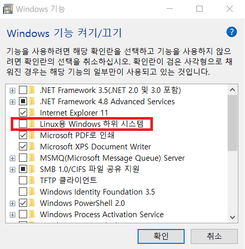 1. 설정 >> windows 기능 켜기/끄기