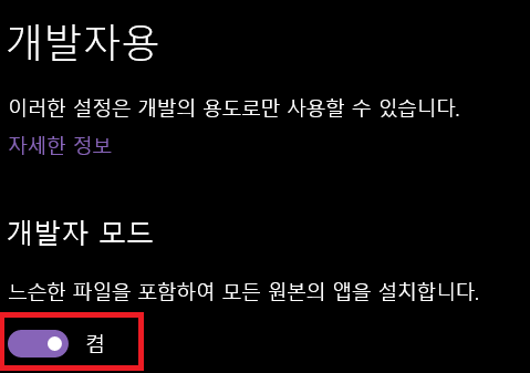 2. 설정 >> 개발자용 기능 사용 체크